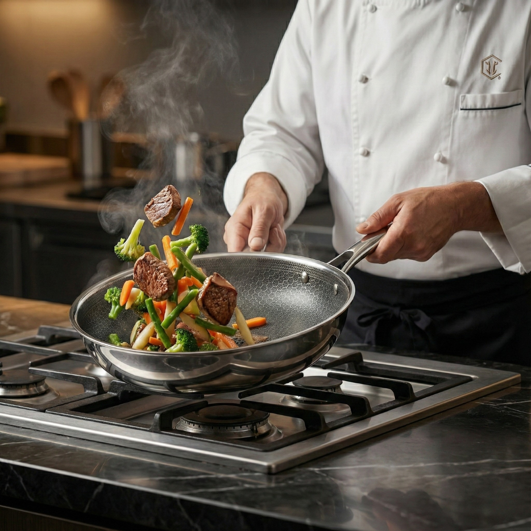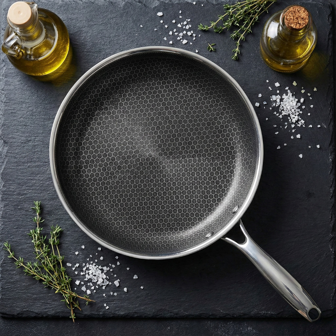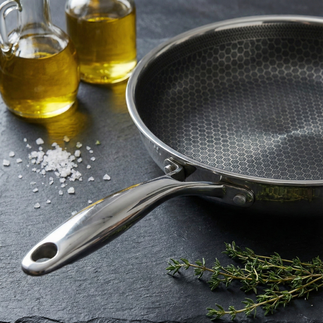 מחבת היברידית המשלבת את היתרונות של נירוסטה ונון סטיק לביצועים מושלמים במטבח.