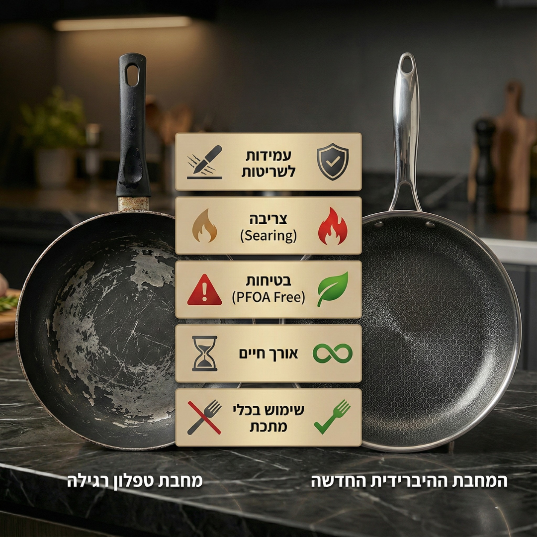 חוו את השילוב המושלם של עמידות בריאות ונוחות אנטי-סטיק. המחבת ההיברידית שלנו משלבת חומרים מתקדמים לביצועי בישול מעולים.